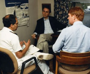 Carl Sagan (en el centro) charla con trabajadores de los CDC, en 1988.
