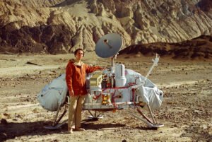 Sagan junto a una maqueta de las sondas Viking, destinadas a posarse sobre Marte. El científico estudió los posibles lugares de aterrizaje con Mike Carr y Hal Masursky.